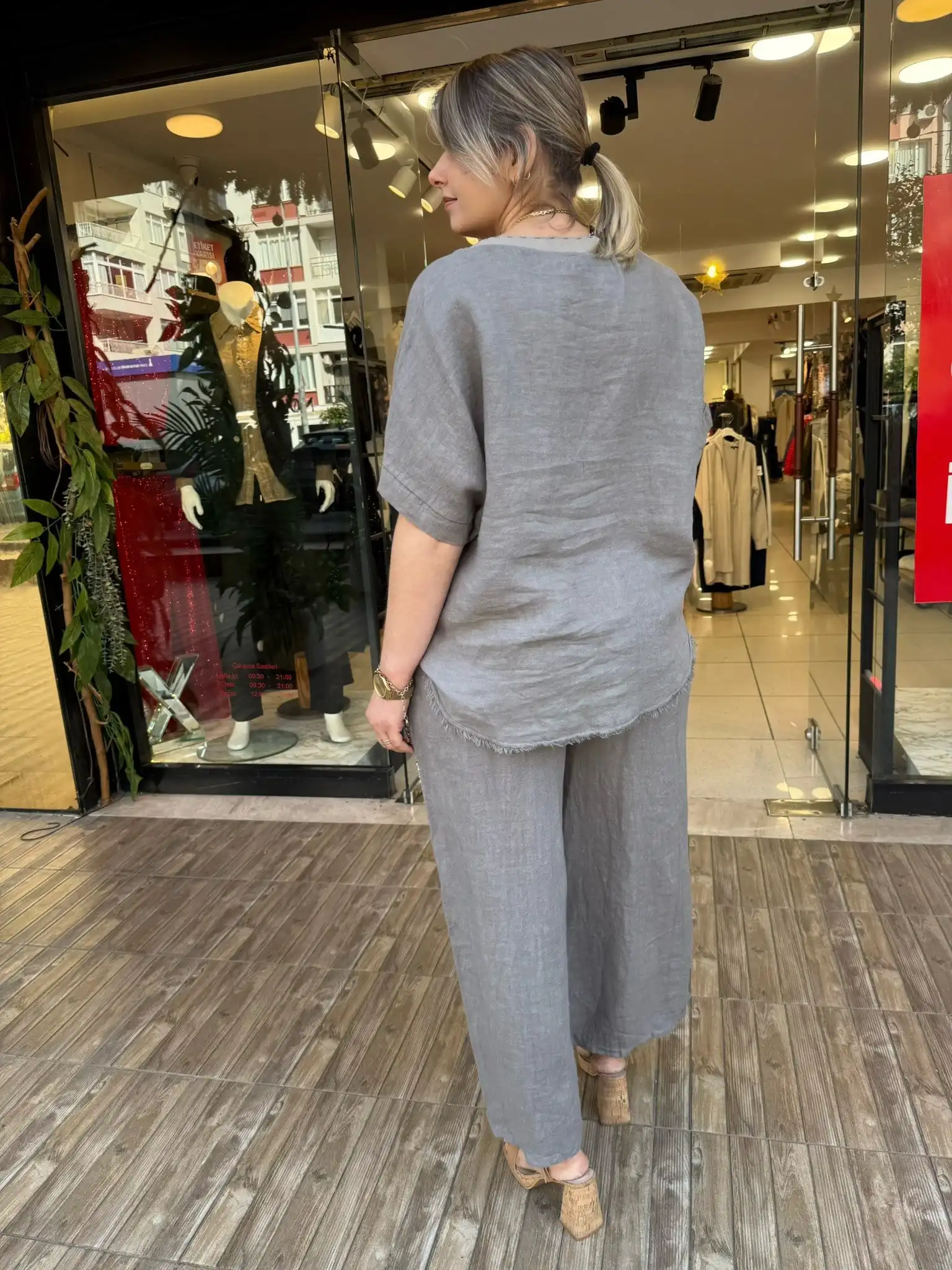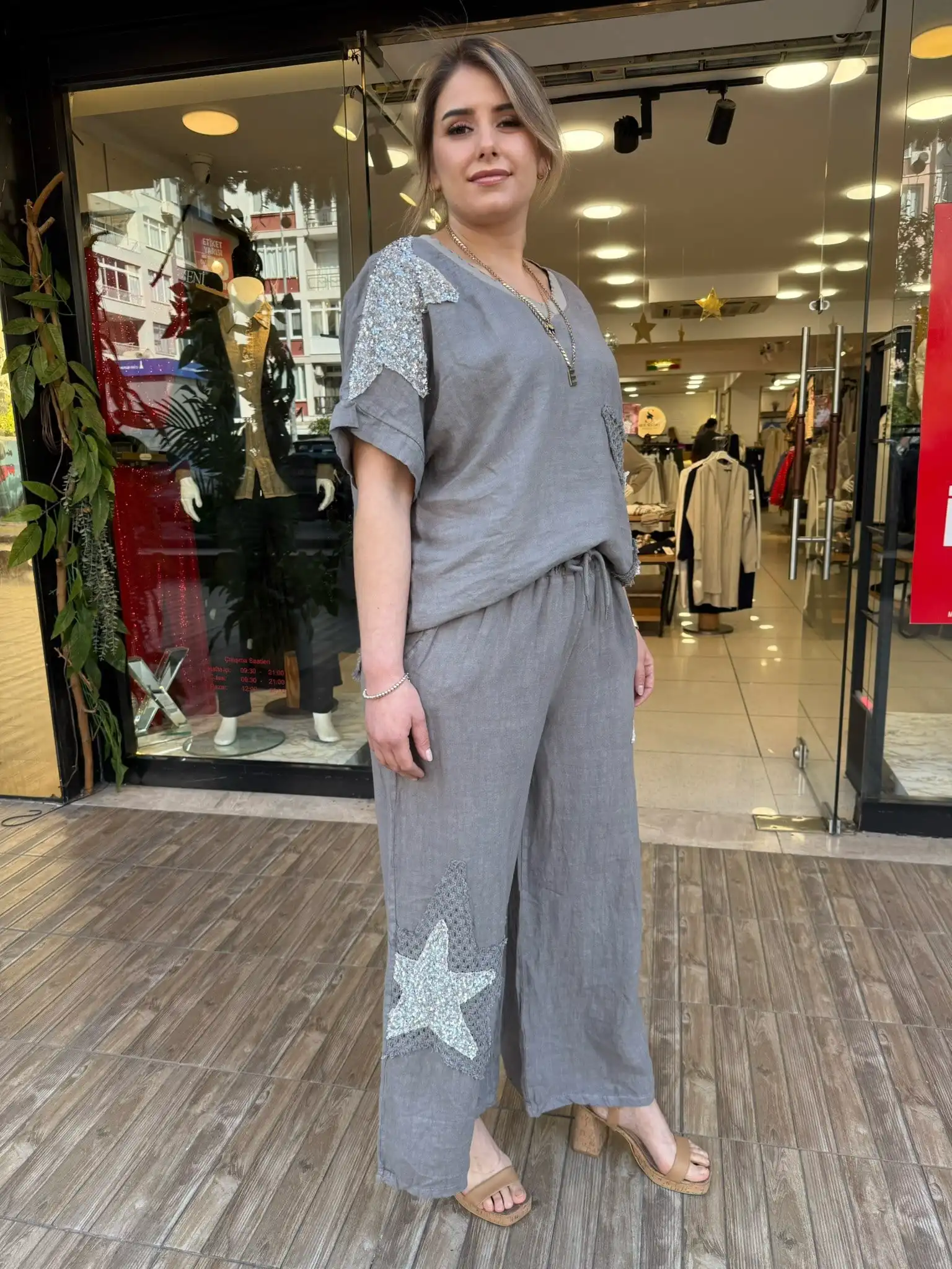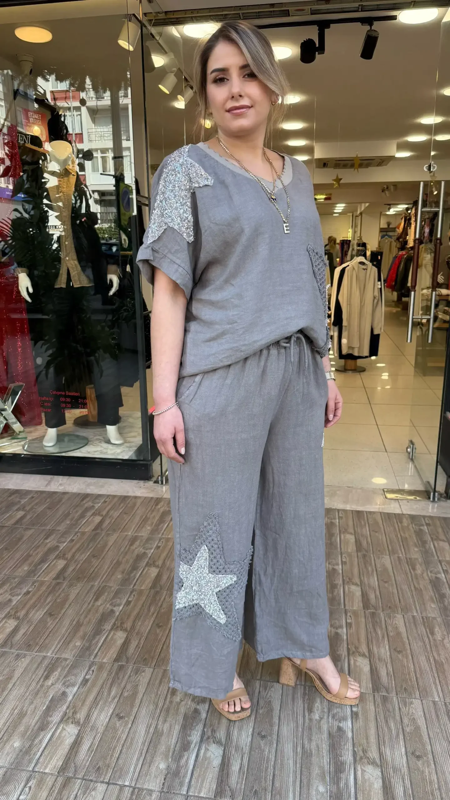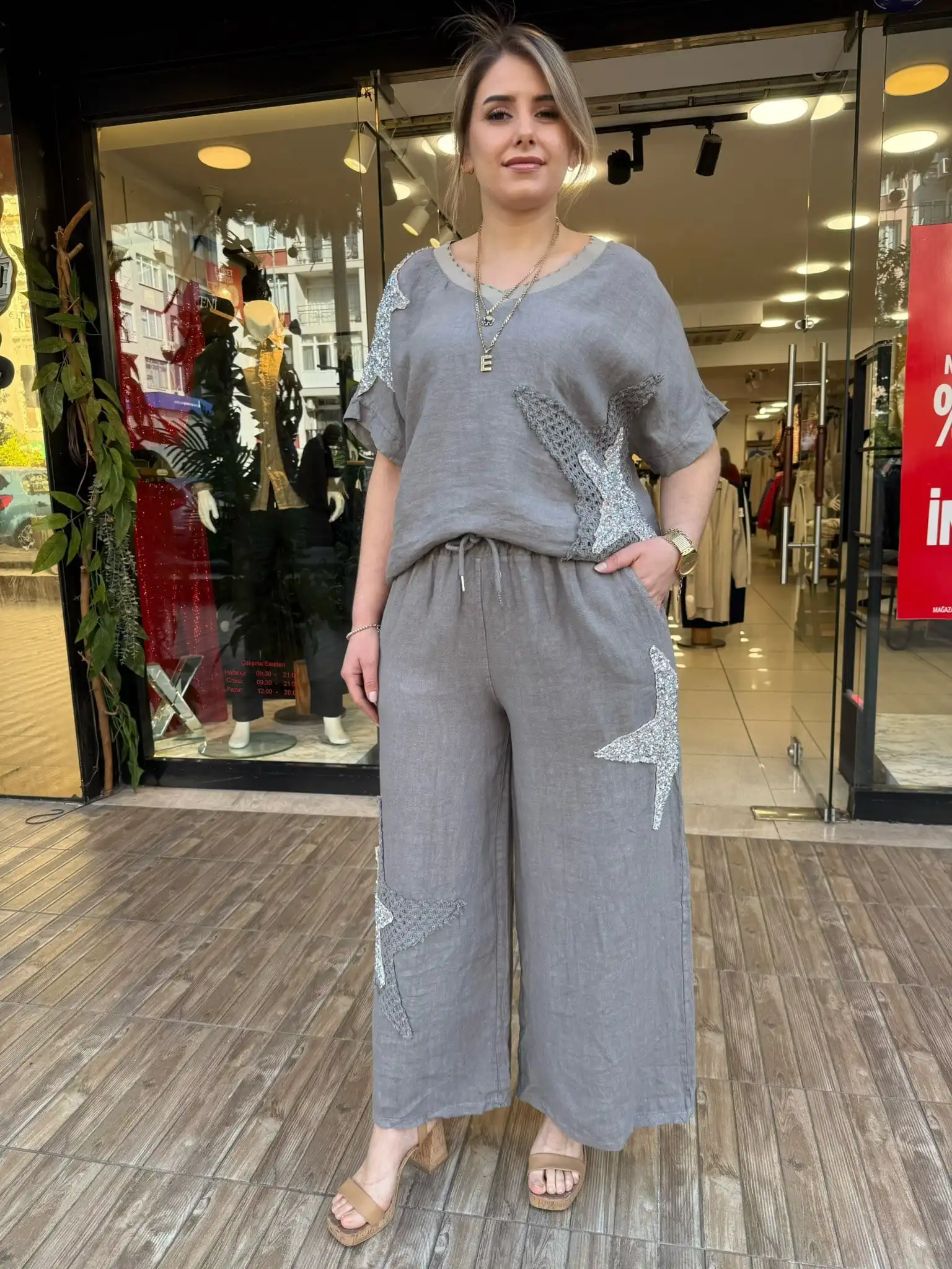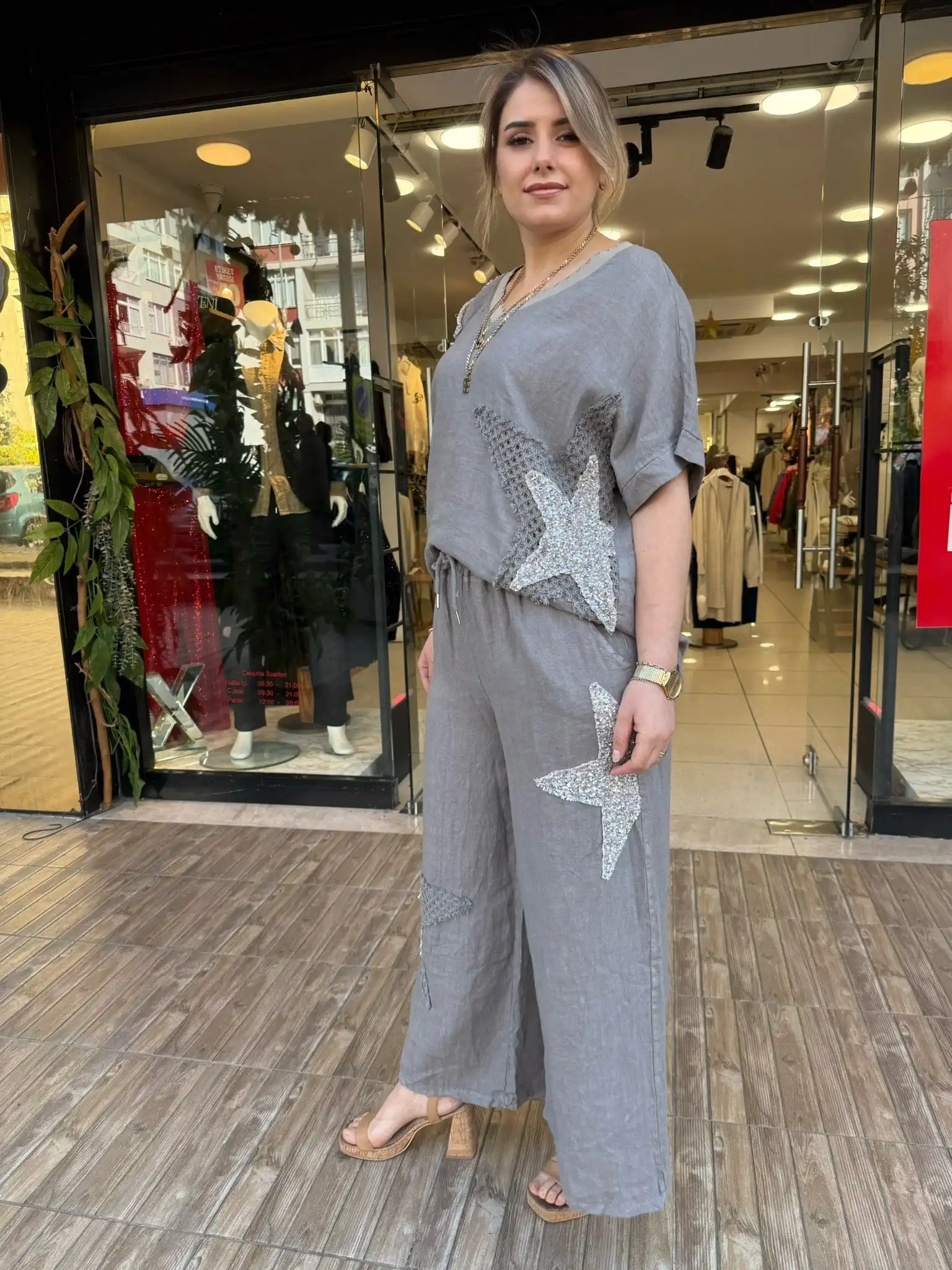 ✨ Yıldız Detaylı İtalyan Keten Takım ✨