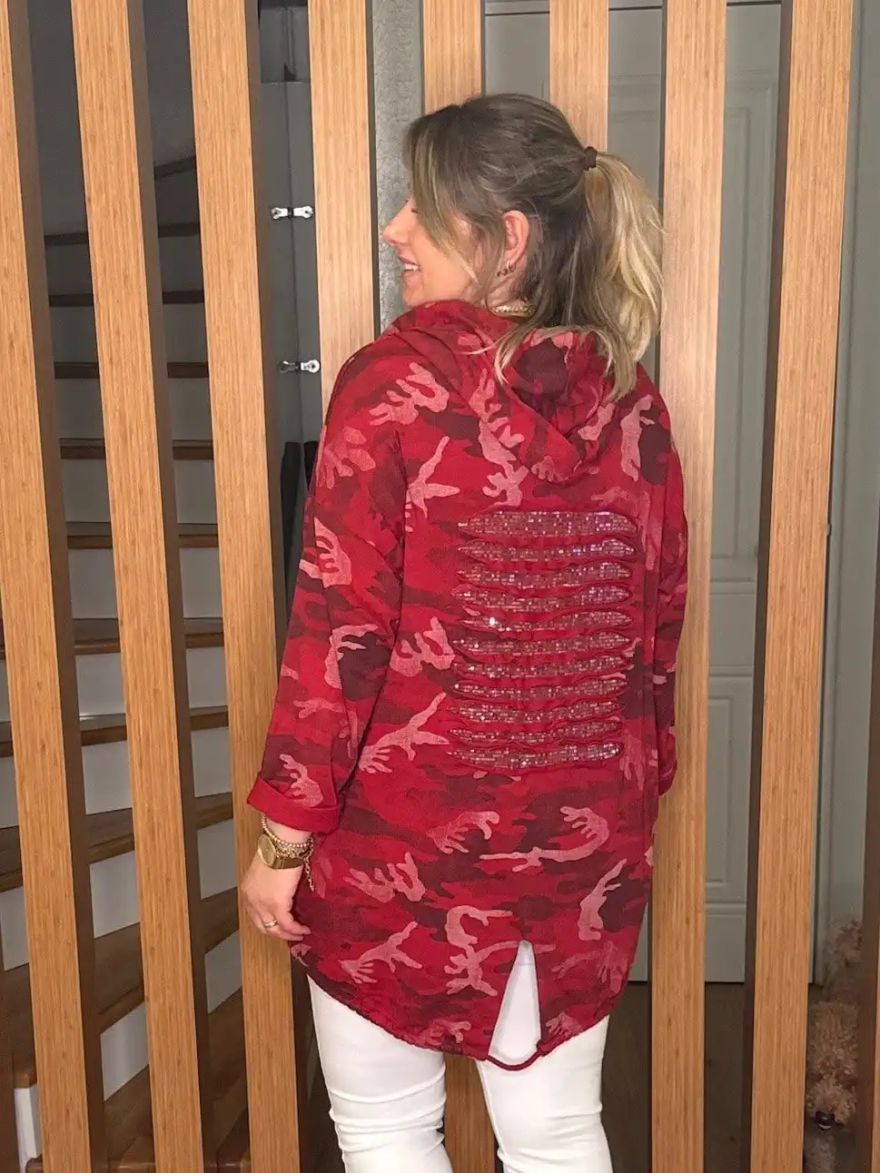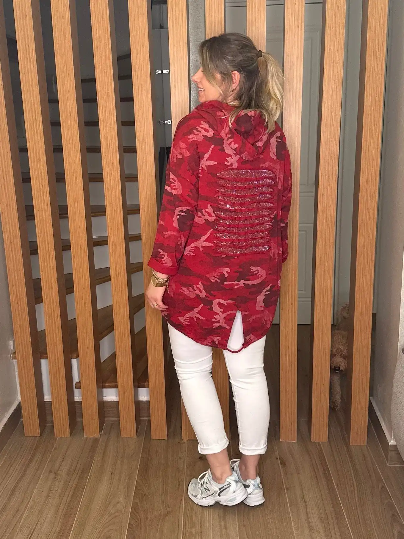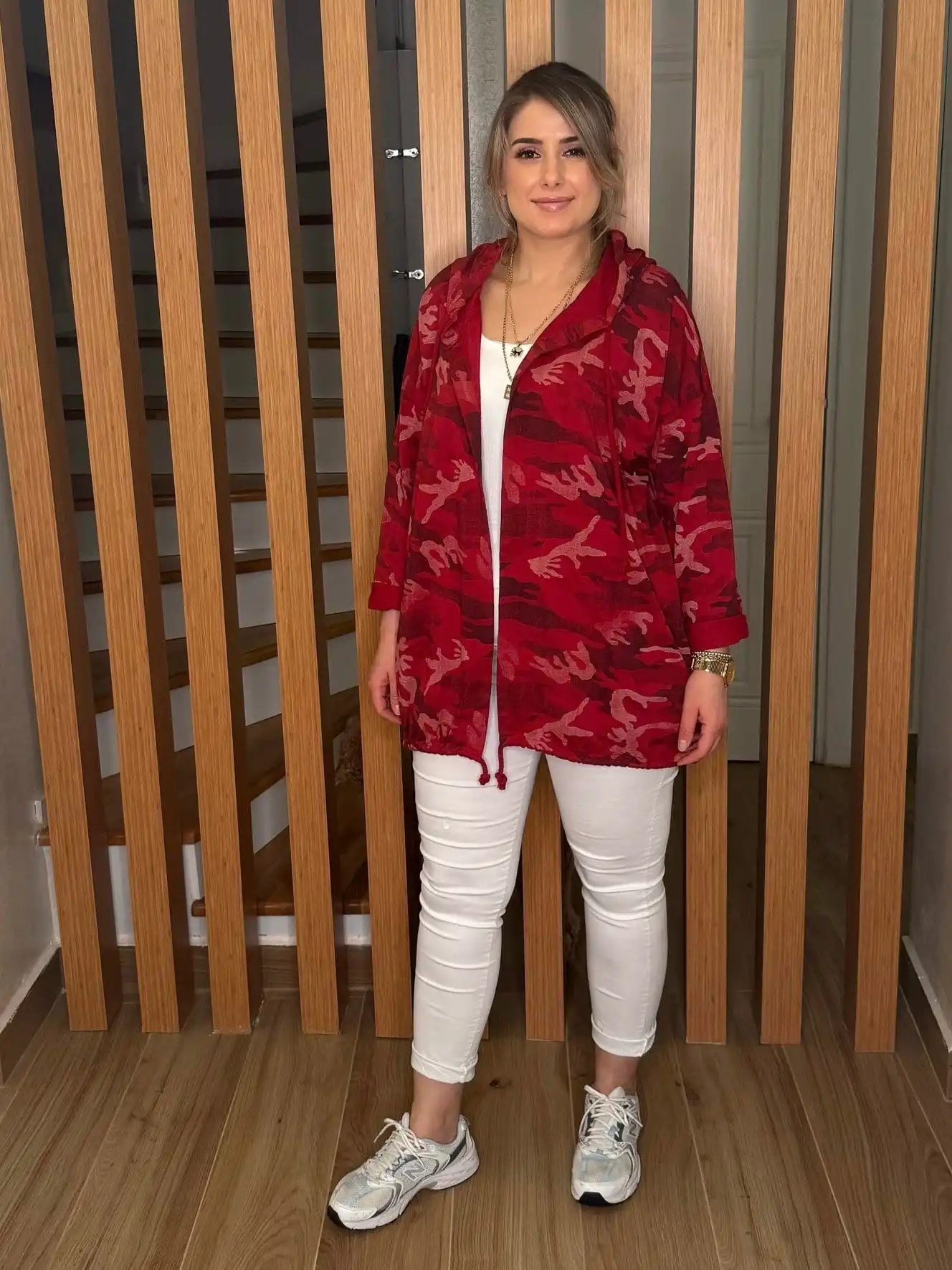 Tasarım: Modern kırmızı kamuflaj desenli, spor-şık kesim.
