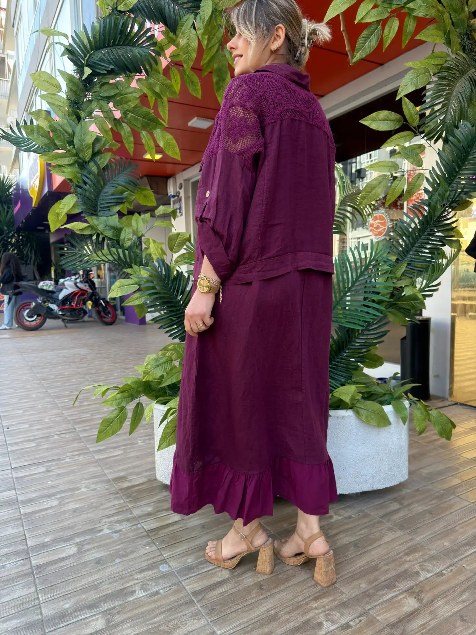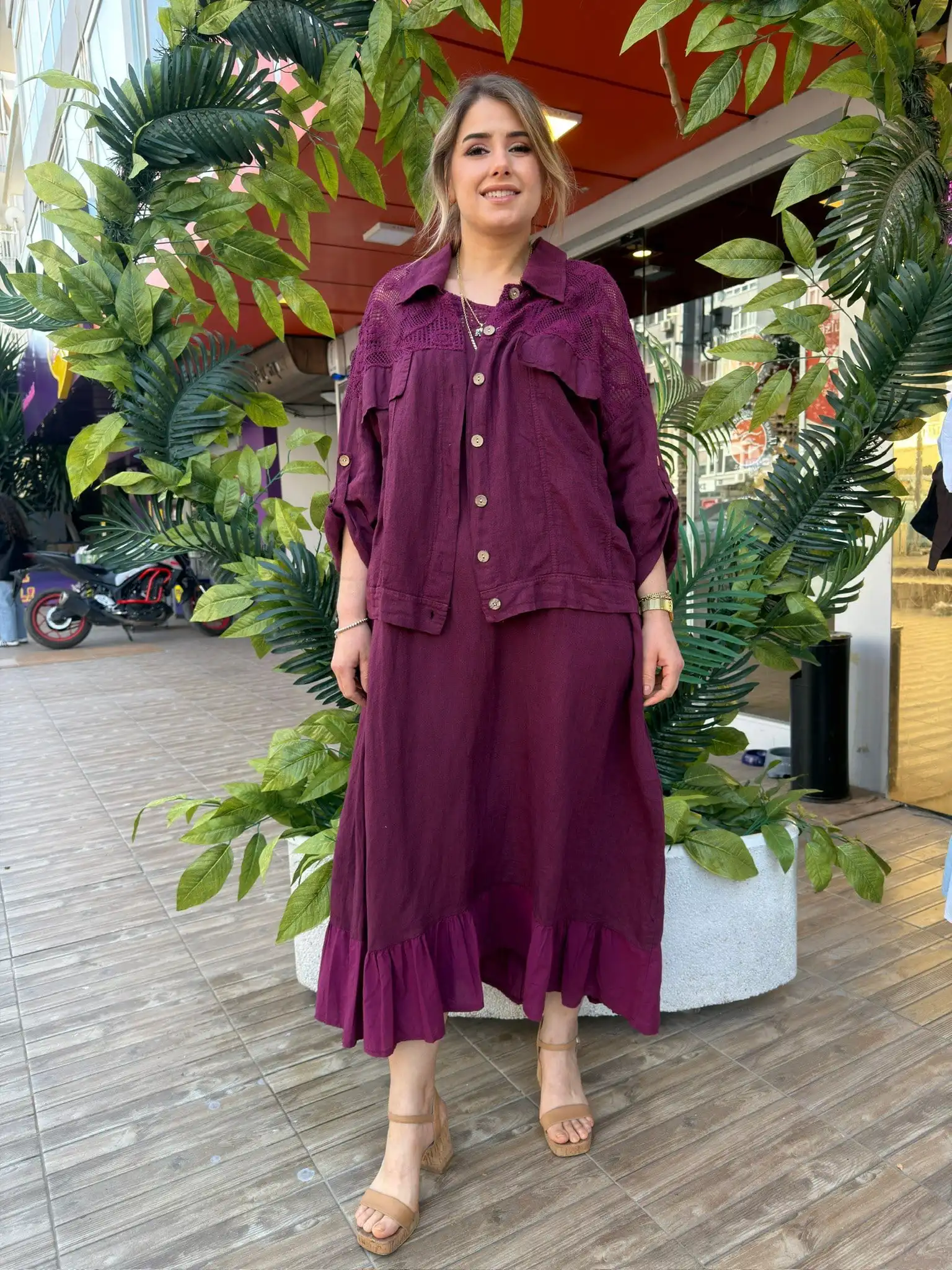 İtalya’nın yüksek kaliteli keten dokusunu, zarif el işçiliği fisto detaylarıyla buluşturan bu özel set, hem konforu hem de şıklığı bir arada sunuyor. Nefes alan doğal içeriği sayesinde sıcak günlerde serin tutarken, oversize kesimiyle modern bir silüet oluşturur.