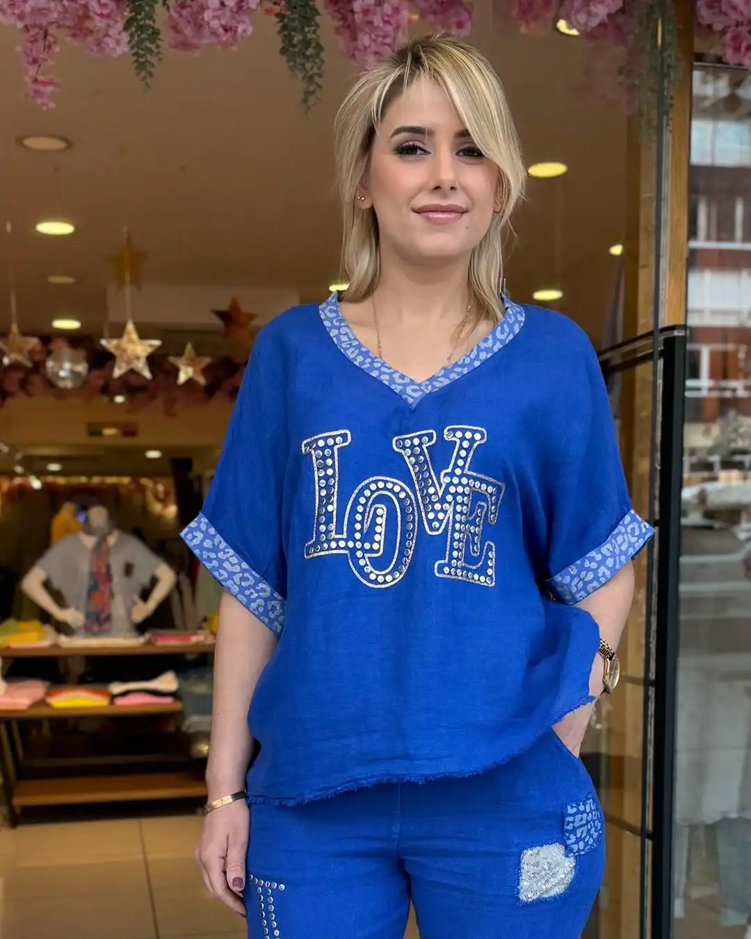 Tasarım: Sağ bacak üzerinde dikey “LOVE” yazılı taş işleme; sol bacak üzerinde ise pul ve payet detaylı yamalar mevcuttur.