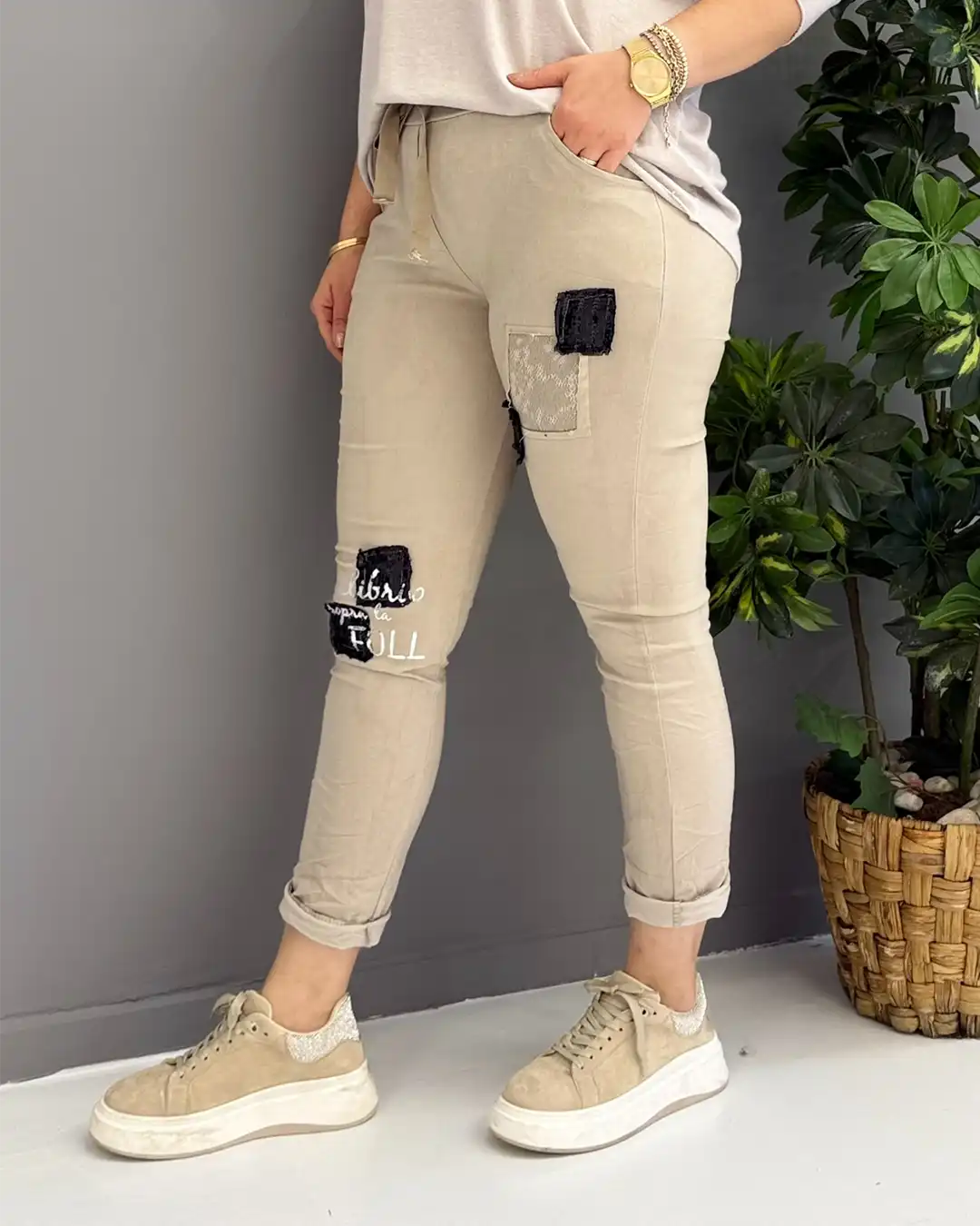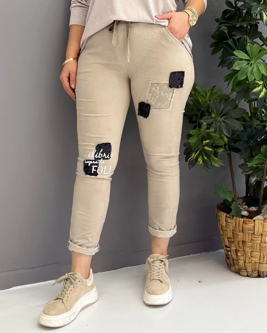 Ürün Detayları: Şıklığı ve rahatlığı bir arada sunan bu İtalyan tasarımı pantolon, gardırobunuzun en joker parçası olacak. Ön kısmında yer alan payet, dantel garniler ve modern yazı baskılarıyla stilinizi bir adım öne çıkarır. Yüksek kaliteli kumaş karışımı sayesinde gün boyu hareket özgürlüğü sağlar.